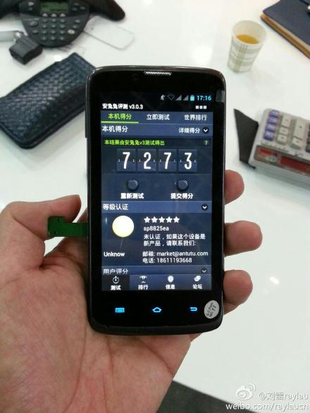 有关展讯第一款TD-SCDMA双核芯片“Tiger”传闻一直不断,但却一直“只闻其声,未见其身”。根据近日微博网友爆料,这款代号虎的芯片或将离“下山”之日不远了。日前,新浪认证为“深圳展维锋通讯技术有限公司多媒体事业部总经理”的刘雷发布了一条微博,并配有一张工程样机运行安兔兔跑分软件测试的截图,刘雷在微博中称“SP8825,7273分,Tiger很能跑”,很显然这个SP8825就是指展讯的双核TD芯片“Tiger”,微博配图中显示搭载了SP8825的手机安兔兔跑分为7273,对于双核芯片来讲,这个跑分显然不错(联发科双核芯片MT6577安兔兔跑分在6000分左右),而且刘雷也表示“很能跑”,可见Tiger的性能表现不俗。